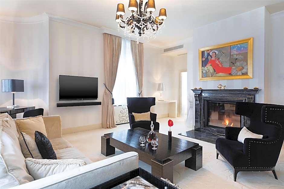 This suite provides a fireplace. A seating area, a desk, a balcony and a tea and coffee maker are featured in this spacious suite. The unit offers 1 bed.